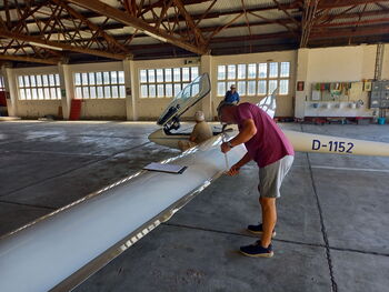 Nach den anstrengenden Flügen in der Montagshitze hat sich unser Flugbetrieb am Dienstag lediglich auf Schulung begrenzt, bevor wir dann am Mittwoch einen Tag Flugpause eingelegt haben. Dennoch haben wir die Zeit sinnvoll genutzt und unser Fliegerfreund Reinhold hat sich am Vormittag im Schatten der Segelflughalle daran gemacht bei unseren Einsitzern die Jahresnachprüfung durchzuführen. hierfür einen herzlichen Dank!