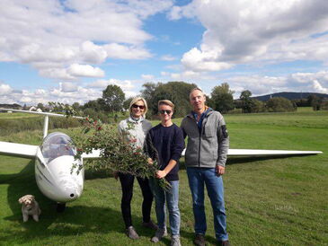 Nach der dritten einwandfreien Landung war die A-Prüfung geschafft und Nicolas hat somit den ersten Ausbildungsabschnitt zum Segelflugpiloten gemeistert, weshalb er anschließend Glückwünsche von Fluglehrern und Vereinskollegen entgegennehmen konnte. Auch erhielt er einen traditionellen "Blumenstrauß" und den Hintern für die Thermik sensibilisiert.