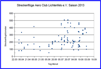 Für die Lichtenfelser Segelflieger war 2013 kein besonders gutes aber auch kein besonders schlechtes Jahr. Nach dem langen Winter und den Überschwemmungen konnten wir erst Anfang April richtig loslegen. Die Flüge waren kleinräumig und mit geschickter Routenwahl gelangen Flüge zwischen 200km und 350km Länge.