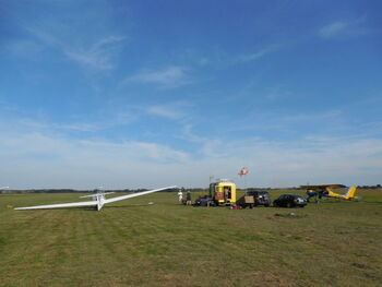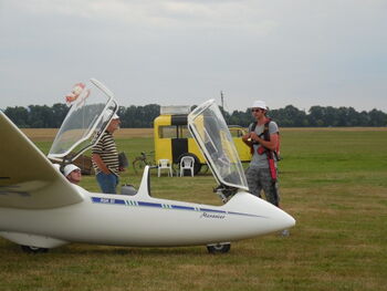 Der Freitag war ein reiner Blauthermiktag - richtiges "Ka8-Wetter". Nur ab und zu zogen einige Cirren über den Himmel. Alexander nutzte den Tag, um mit unserer Ka8 fast 6 Stunden lang die Gegend zu erkunden. Da der Wind aus südlicher Richtung kam, starteten wir heute auf der Piste 10. Rudolf und Jan schnappten sich schon früh am Tag die ASK und nutzten die Zeit vor dem Einsetzen der Thermik, um Windenstarts zu üben.
