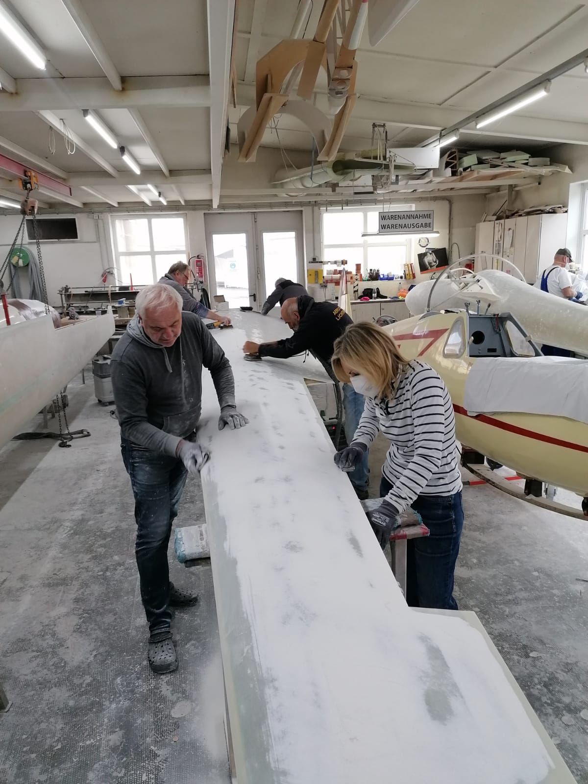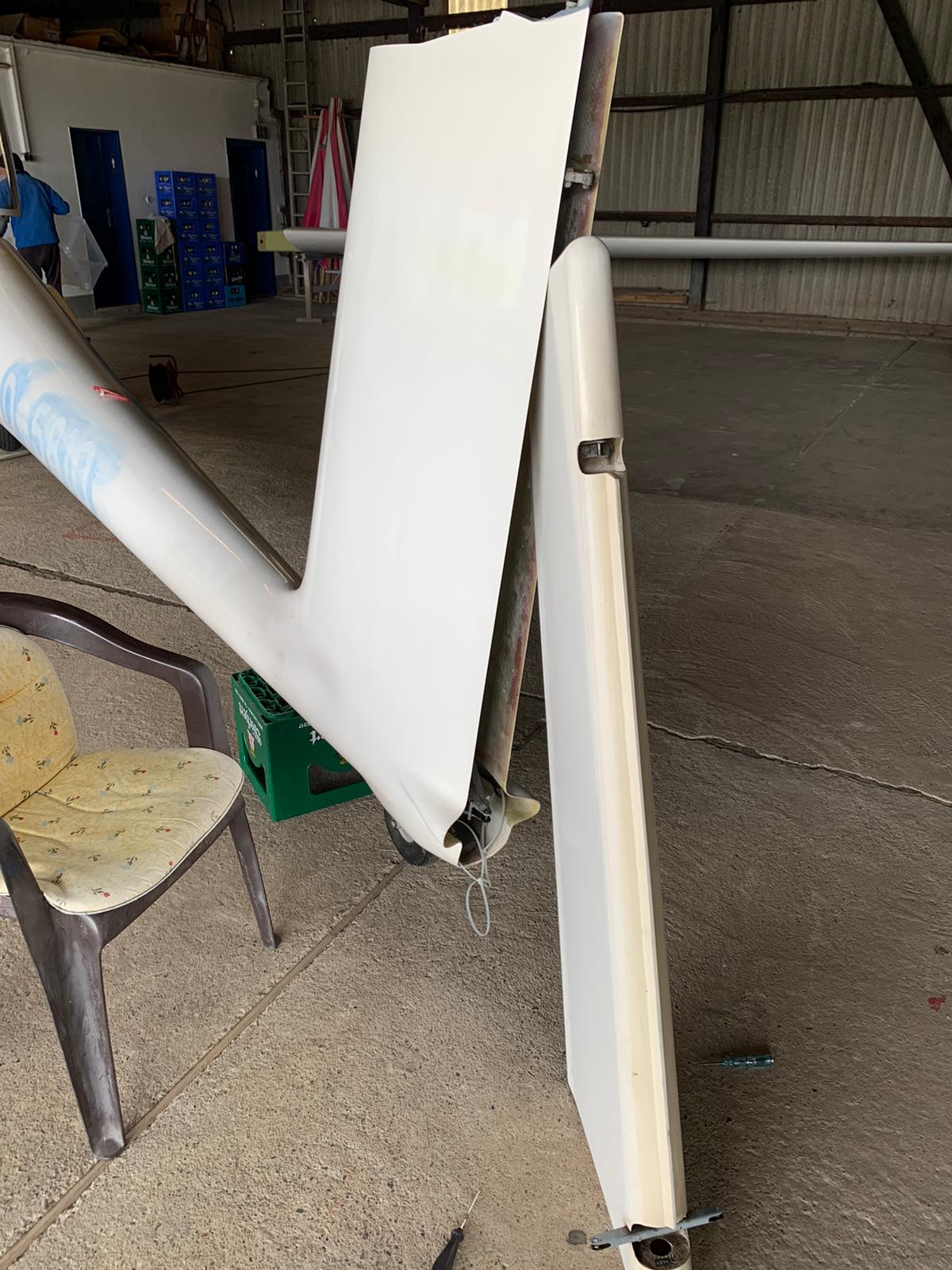 Bereits im vergangenen Oktober begannen die Arbeiten an unserer ASK21. Zunächst galt es das Flugzeug zum Saisonende abzurüsten und nahezu das komplette Innenleben von den Instrumenten über die Gurte bis hin zu den Sitzschalen auszubauen. Auch mussten sämtliche Lackierungen wie das Kennzeichen entfernt werden. Anschließend wurden die Einzelteile in den Anhänger verladen und nach Bamberg zur Firma Eichelsdörfer gebracht. Hier waren wir dann für das restliche Jahr an insgesamt neun Samstagen zu Gast und haben in Eigenarbeit bei knapp 300 geleisteten Arbeitsstunden den alten Lack heruntergeschliffen, um so ein wenig die Kosten reduzieren zu können und auch als Verein gemeinsam an diesem Projekt mitzuwirken. Vielen Dank an die Firma Eichelsdörfer, dass wir hier zu Gast sein durften, sowie an an alle Vereinsmitglieder, die sich hier mit eingebracht haben.